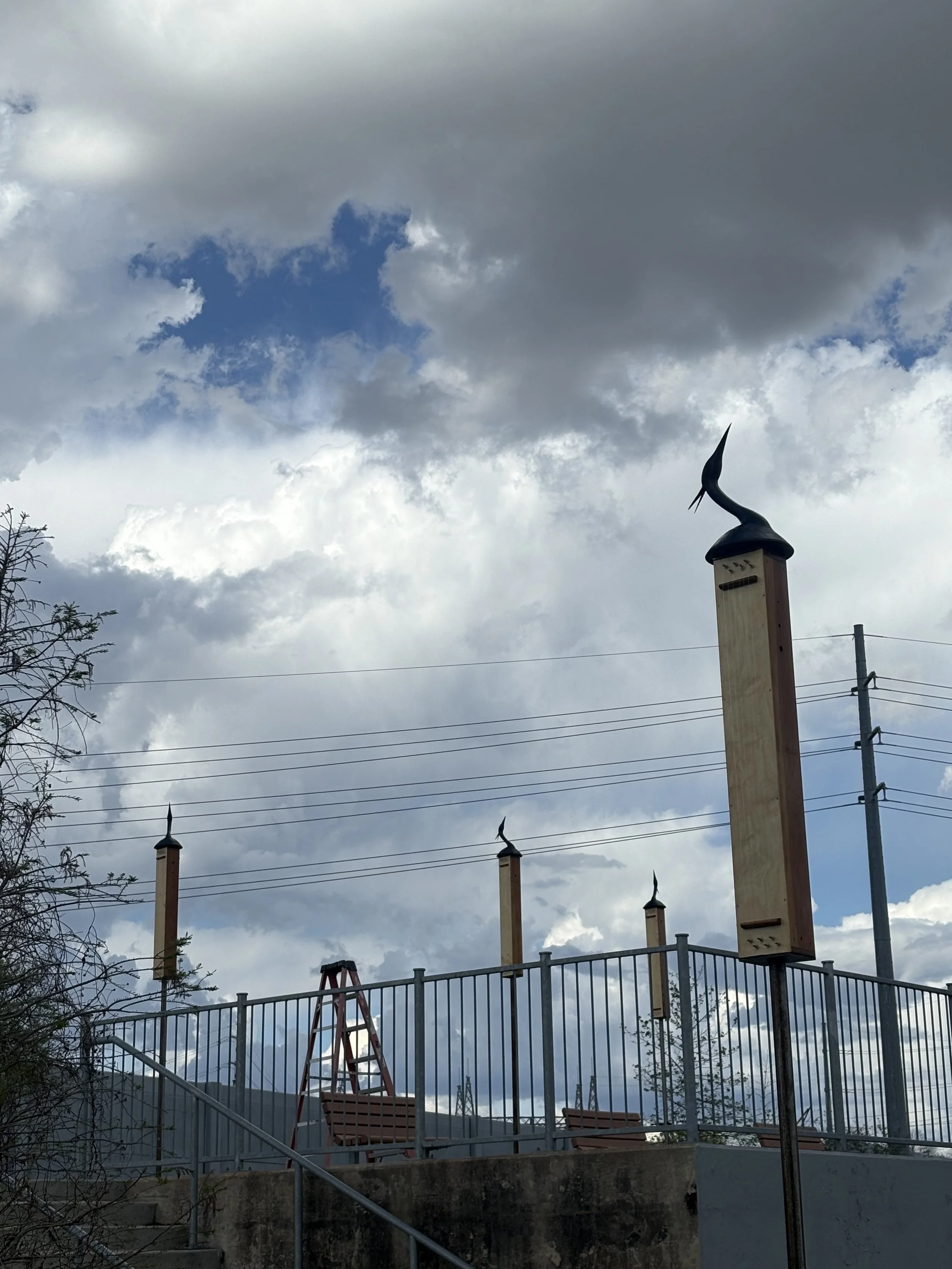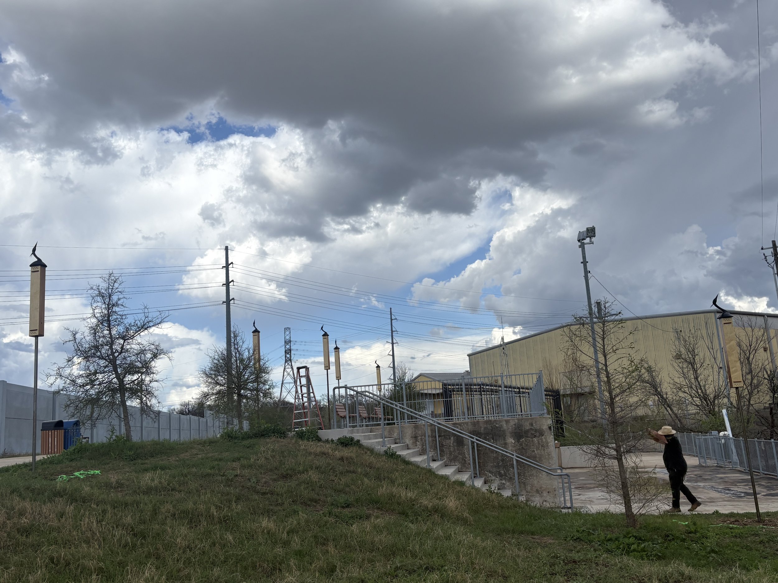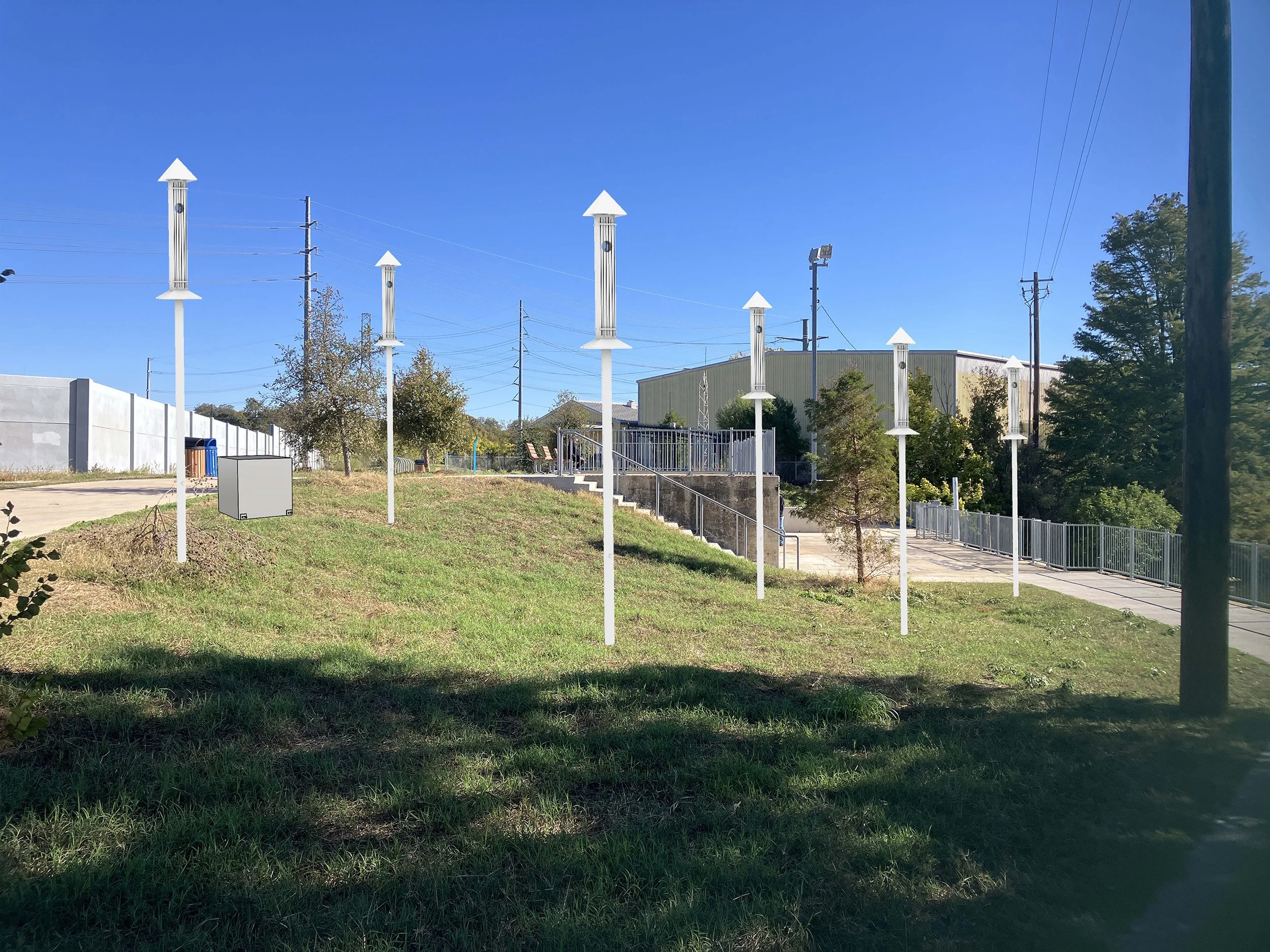Ghost Harps is an installation of 6 Aeolian harps—ancient stringed instruments activated by the wind—producing ethereal sounds both known and unknown. Silhouettes of Great Blue Heron adorn the harps to acknowledge Miakān, from Napakō, the Coahuiltecan creation story, and the unbreakable human bond with water. This installation is intended to evoke witness of—and resonance with—the natural environment, as well as the human and ecological ancestry of this site. implicating our shared calling to support and protect our ecology and humanity. This work was envisioned, assembled, and installed with gratitude and respect for the ancestral stewards of these lands, who continue to enrich our lives and communities: the Coahuiltecan, Tonkawa, Lipan Apache, and Comanche.