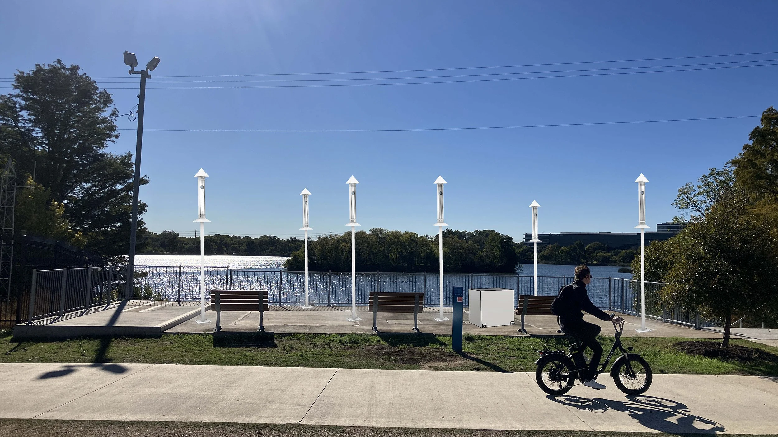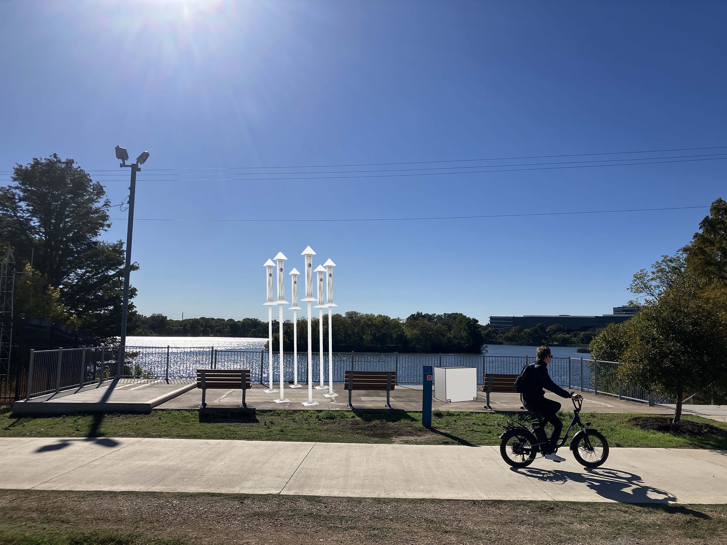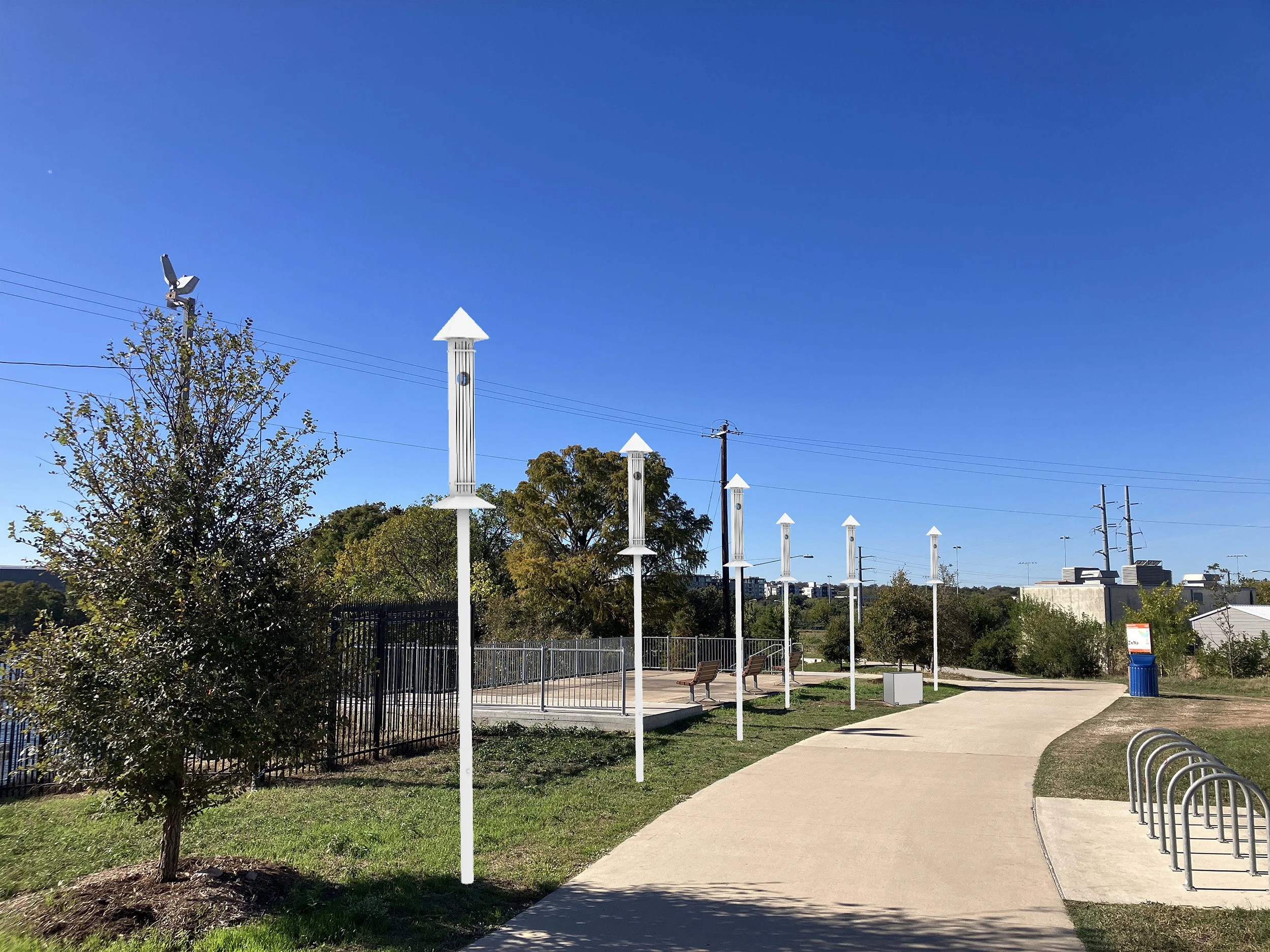 Ghost Harps is an installation of 6 Aeolian harps—ancient stringed instruments activated by the wind—producing ethereal sounds both known and unknown. Silhouettes of Great Blue Heron adorn the harps to acknowledge Miakān, from Napakō, the Coahuiltecan creation story, and the unbreakable human bond with water. This installation is intended to evoke witness of—and resonance with—the natural environment, as well as the human and ecological ancestry of this site. implicating our shared calling to support and protect our ecology and humanity. This work was envisioned, assembled, and installed with gratitude and respect for the ancestral stewards of these lands, who continue to enrich our lives and communities: the Coahuiltecan, Tonkawa, Lipan Apache, and Comanche.